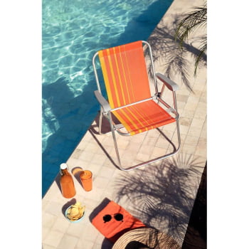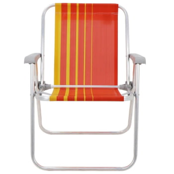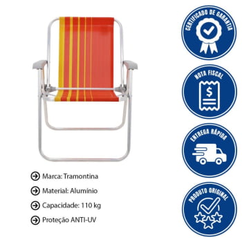 - Com a cadeira de praia Tramontina Samoa Alta em alumínio com assento laranja e amarelo você terá momentos de lazer deliciosos à beira-mar, piscina ou num acampamento com os amigos.